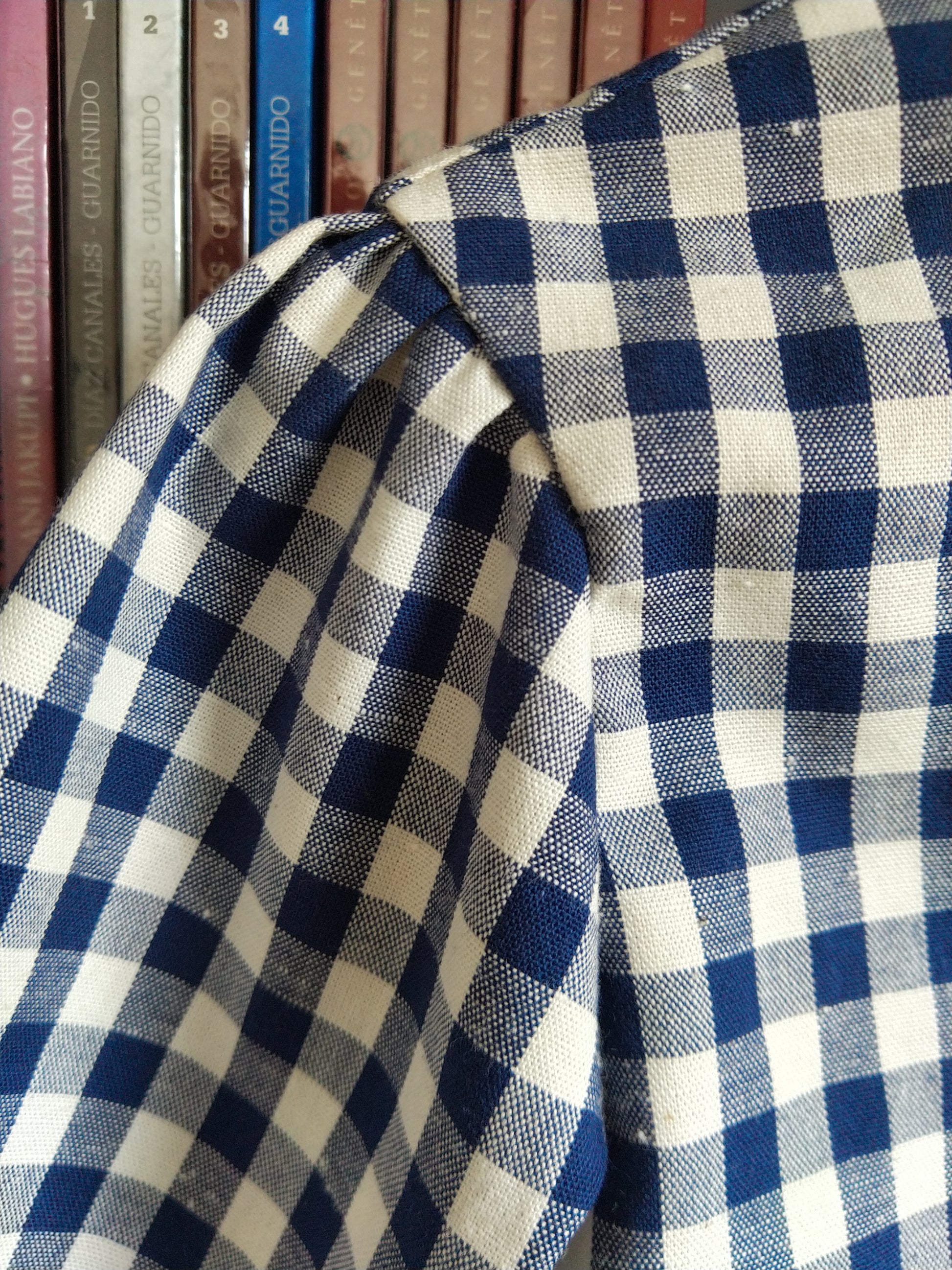 La manche raccourcie annonce le printemps. Cette première pièce est celle que vous allez adorer ! Le chic du col remonté en broderie anglaise associé au classique vichy bleu et blanc, que demander de plus ?