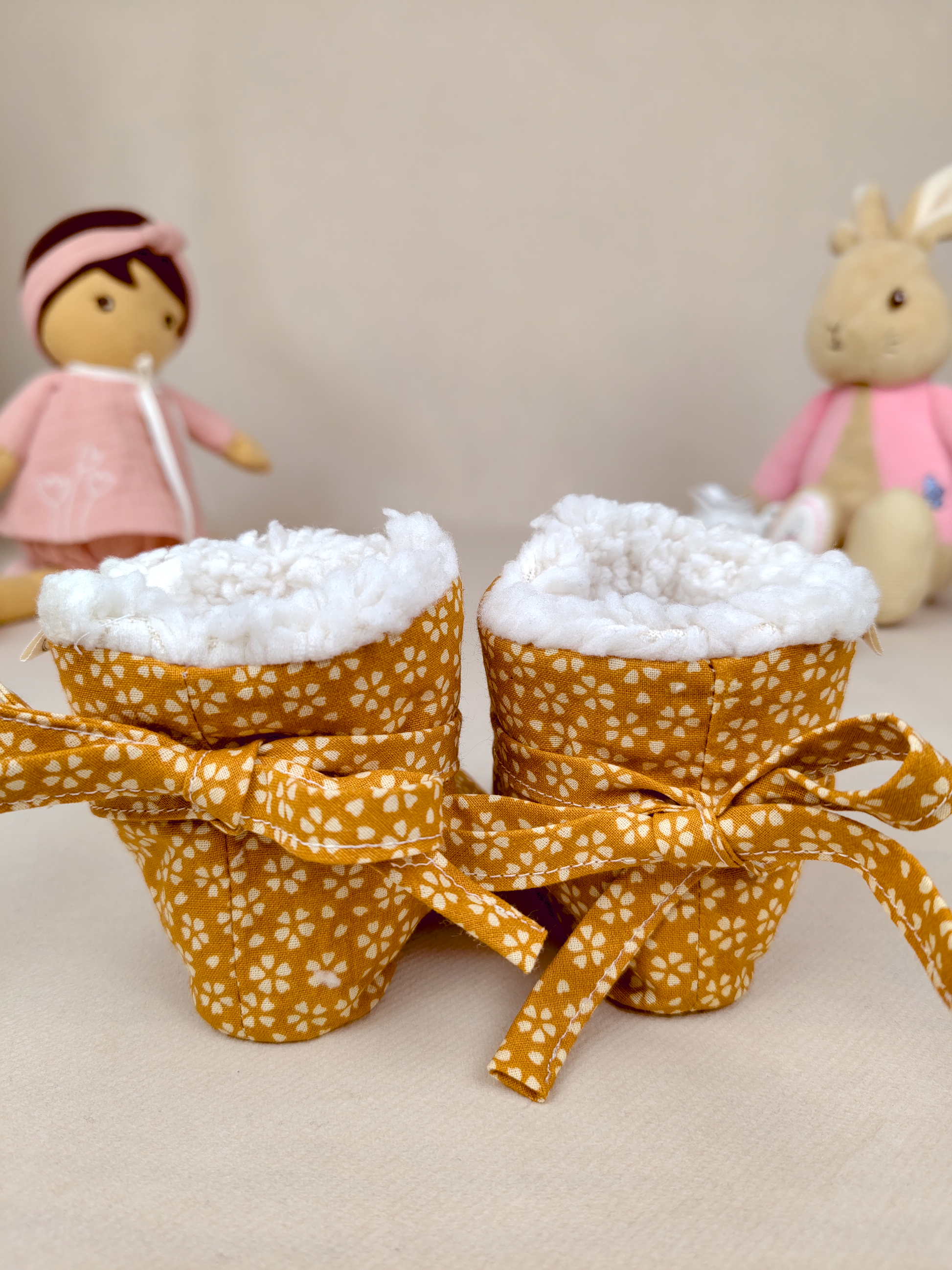 Votre trousseau de naissance sera au complet quand vous y aurez placé ces incontournables accompagnés d’un petit béguin. Les petits pieds seront bien au chaud tout l’hiver grâce à ce grand classique confectionné à la main avec beaucoup de soin dans mon atelier.
