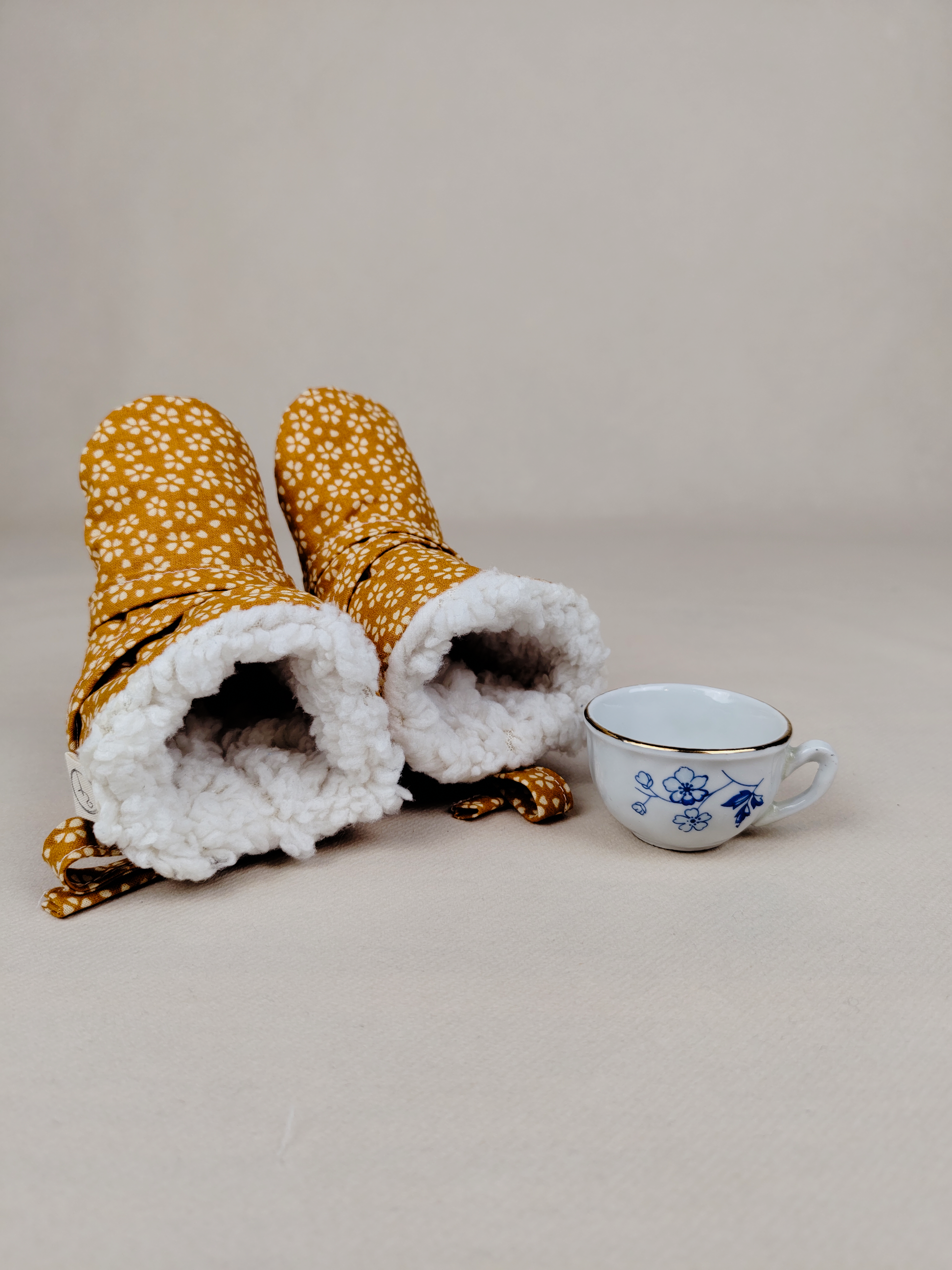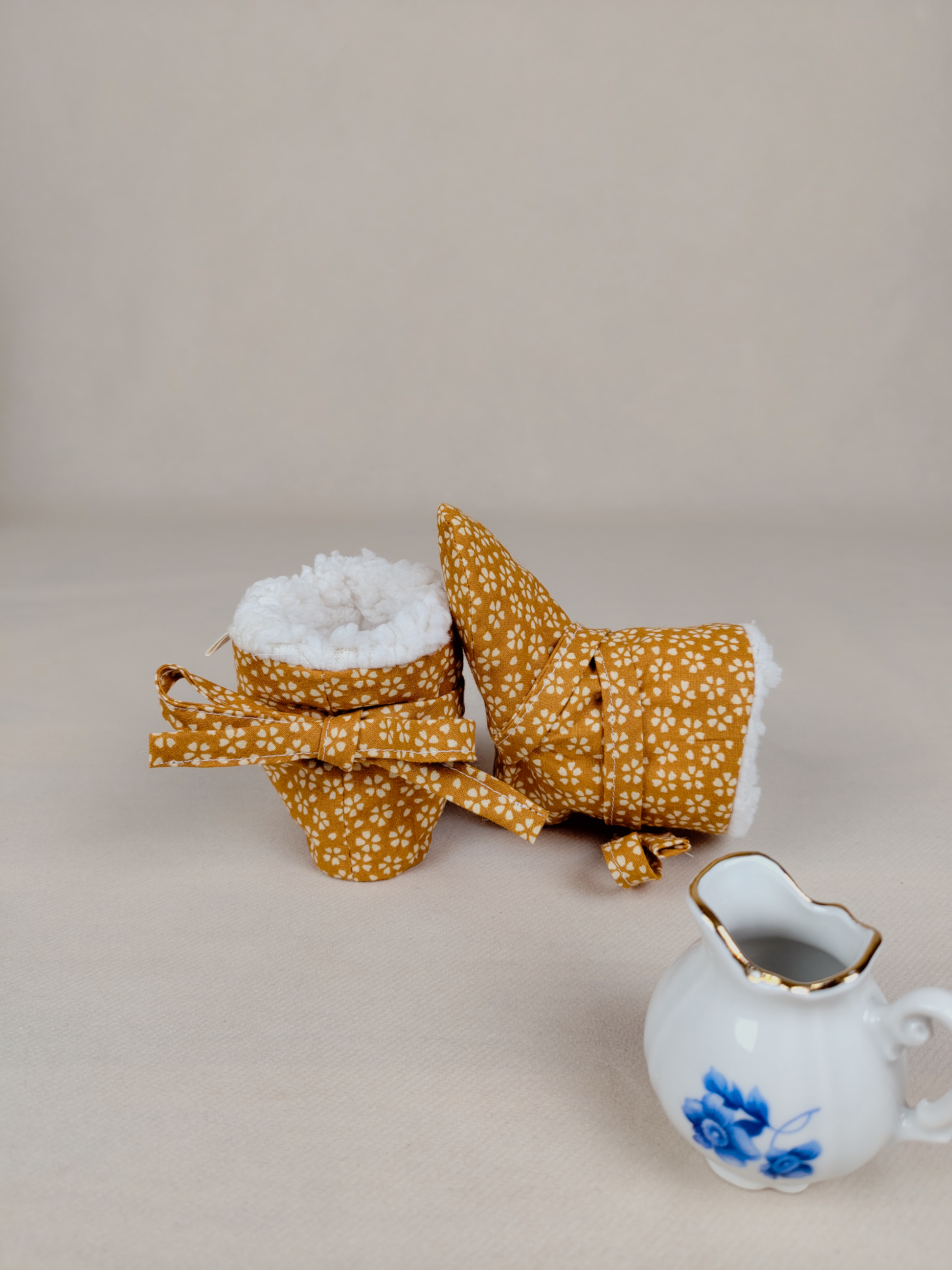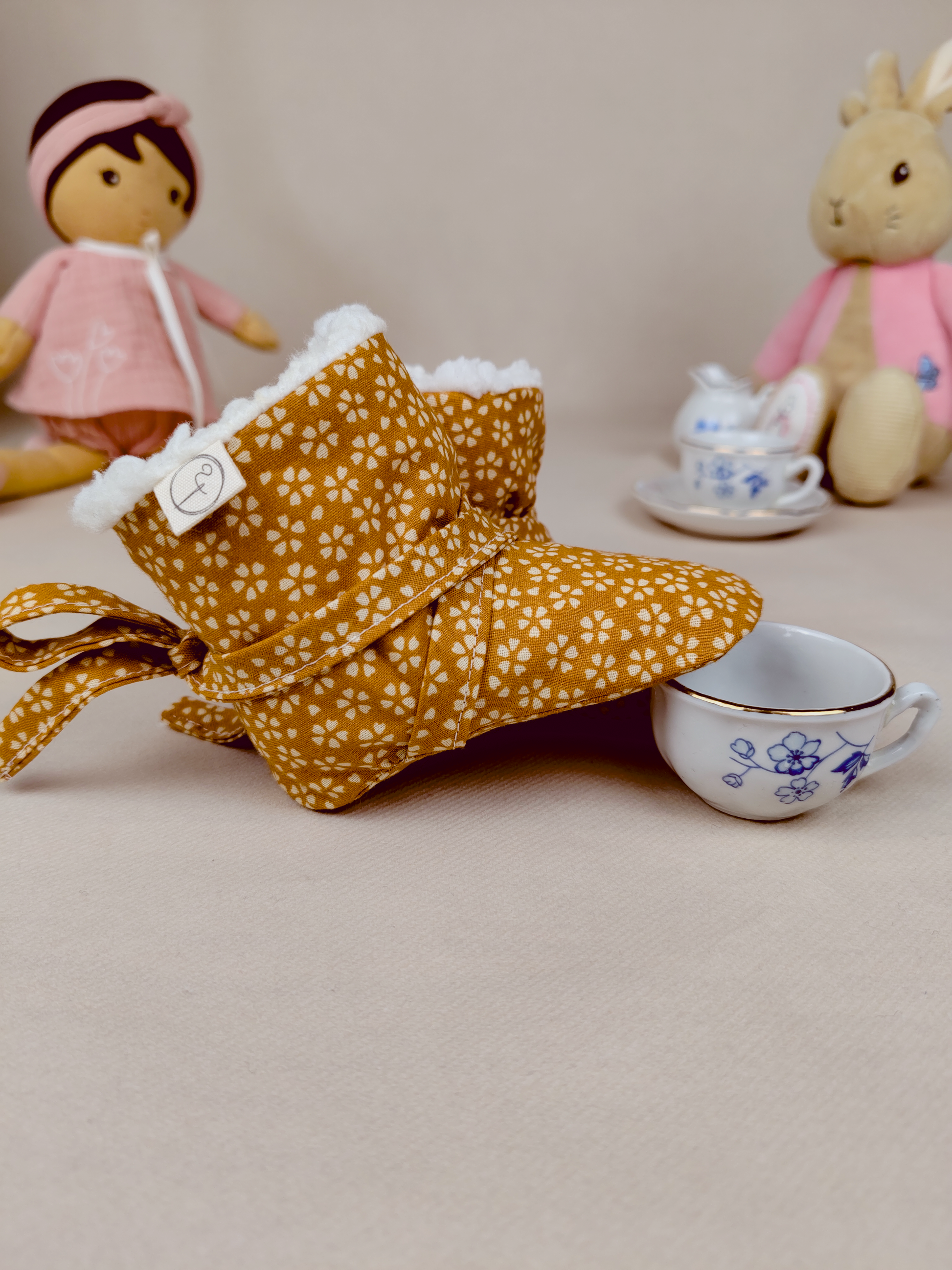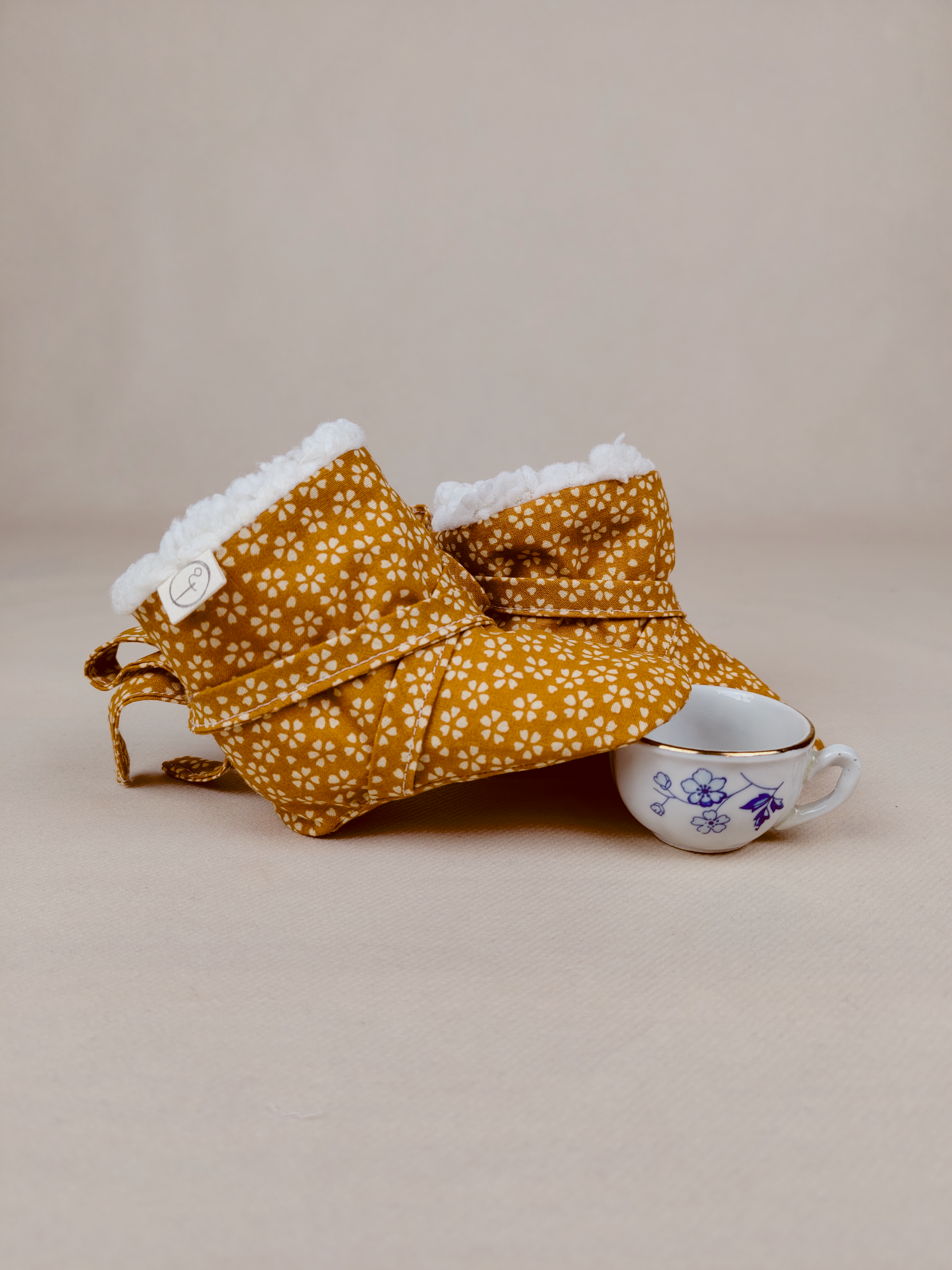 Ces indispensables de la layette, les bottons aux belles fleurs de myosotis accompagneront votre bébé cet hiver. Ces chaussons sont pensés pour être pratique et confortable avec une attache autour de la cheville pour que votre bébé ne les perde pas. Ils sont l’allier de vos sorties en portage. Plus peur d’avoir les pieds froid !