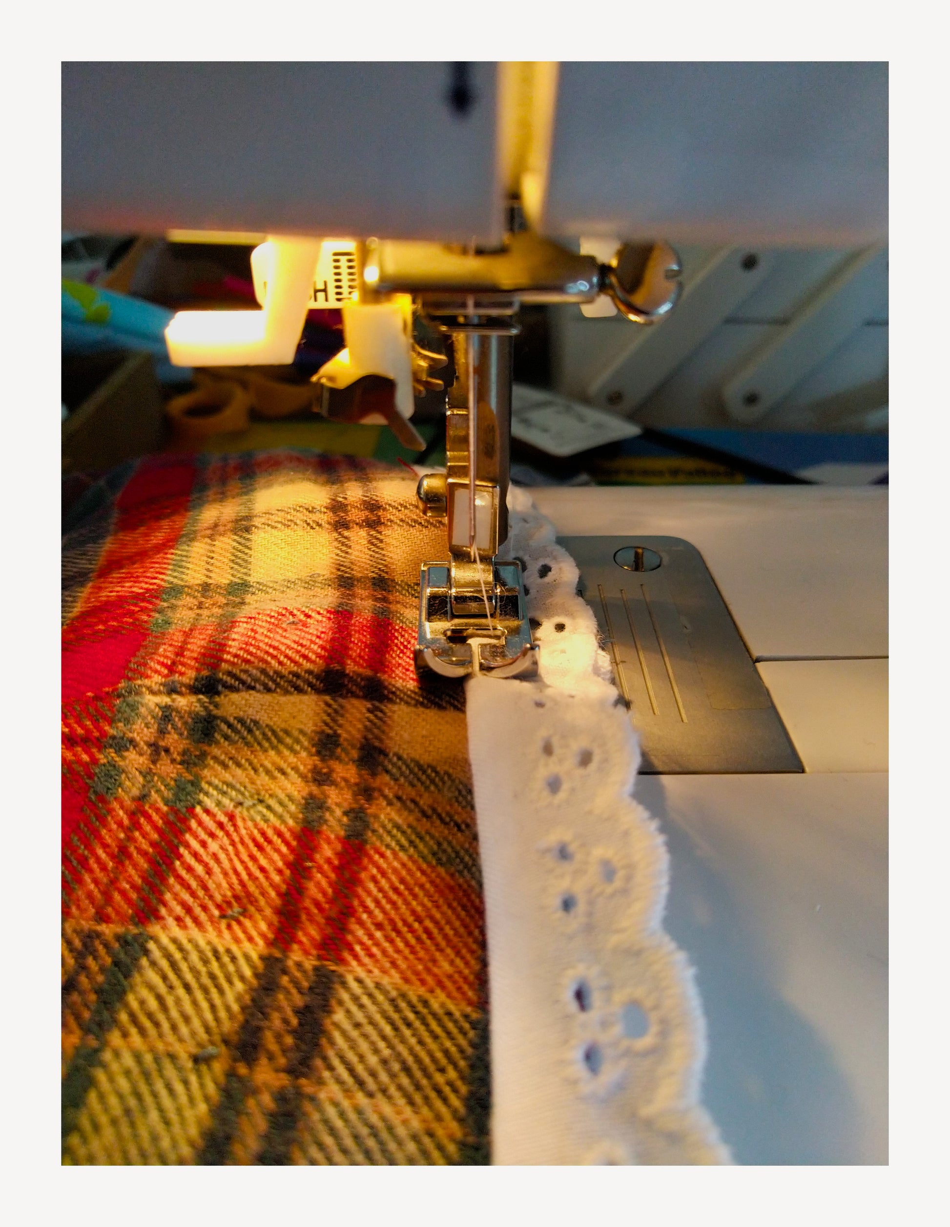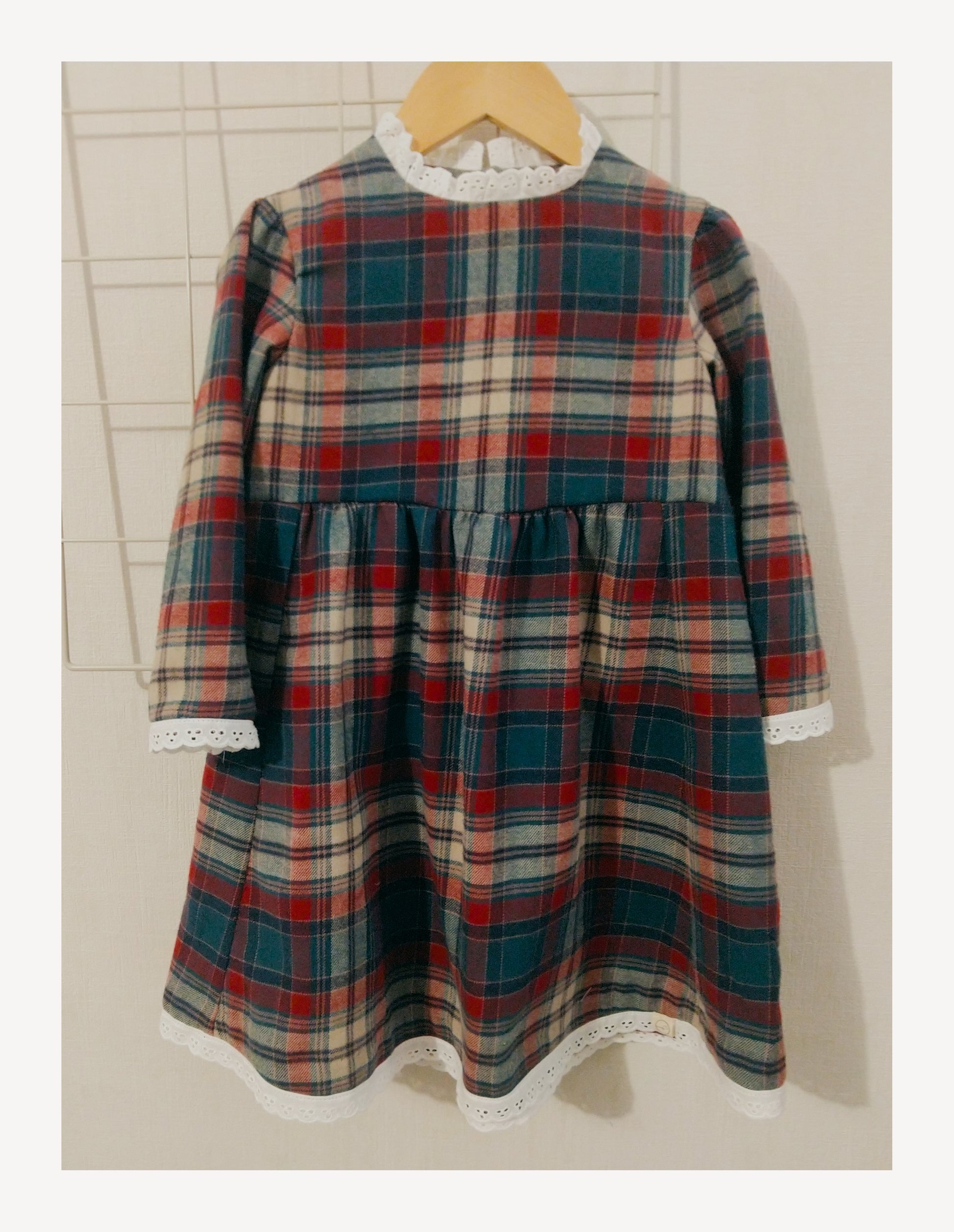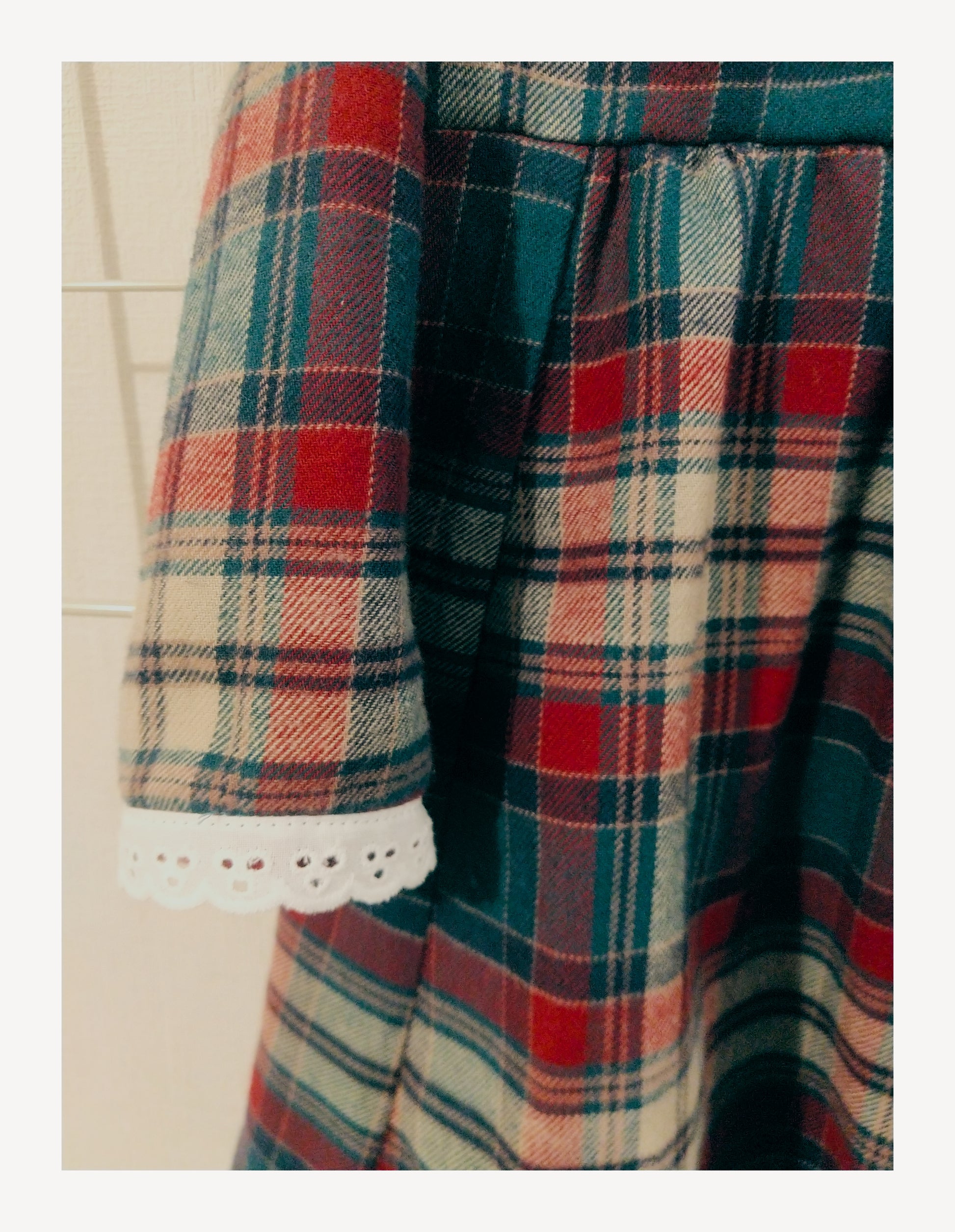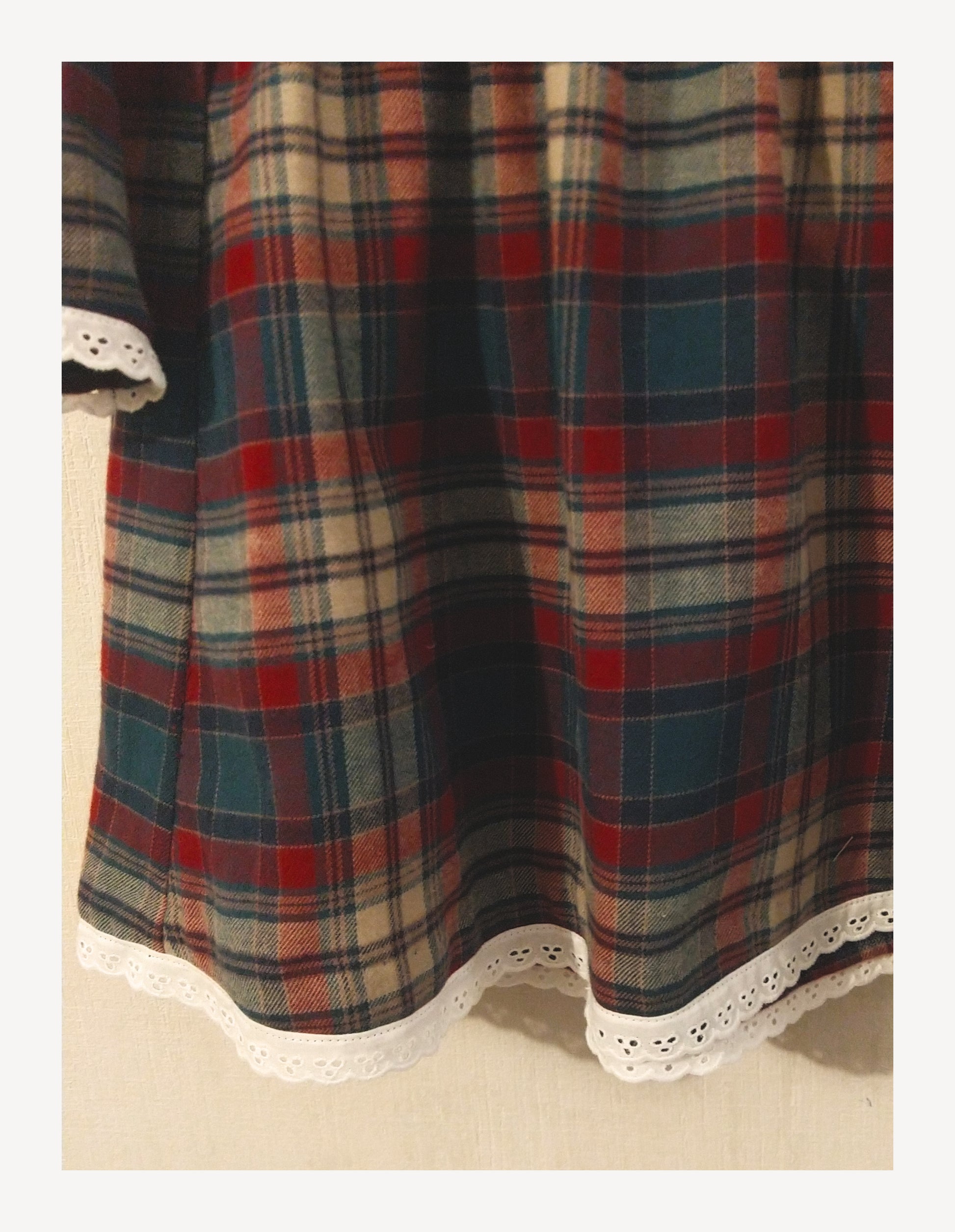 Le tissu choisi pour l'occasion est un tartan en flanelle 100% coton qui lui permet d'être très douce et agréable au touché. Sa longueur midi arrive un peu en-dessous du genou. Elle est très élégante avec ses finitions et son petit col en broderie anglaise.